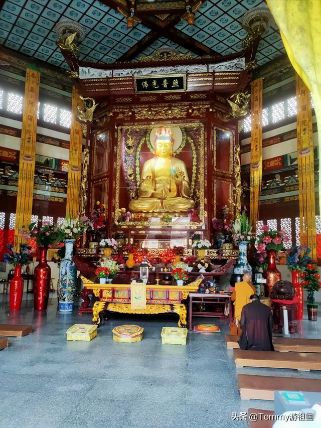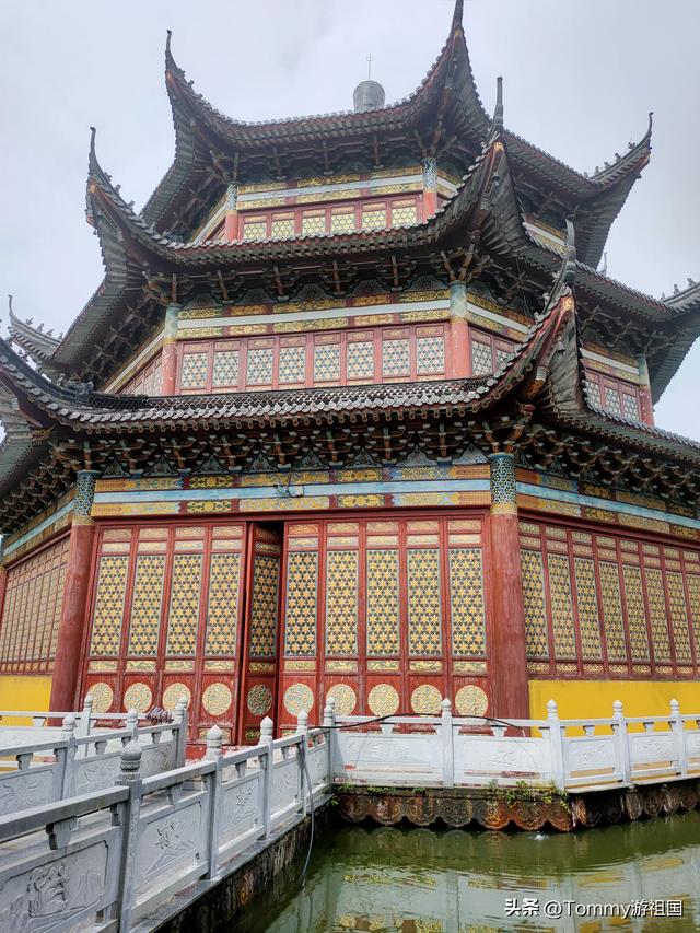 在亭子的后方有一座观音大殿,这座观音殿很独特,周围是圆形的房子包围着,大殿建在池塘中央,为多边形的大殿。里面供奉着观音菩萨。