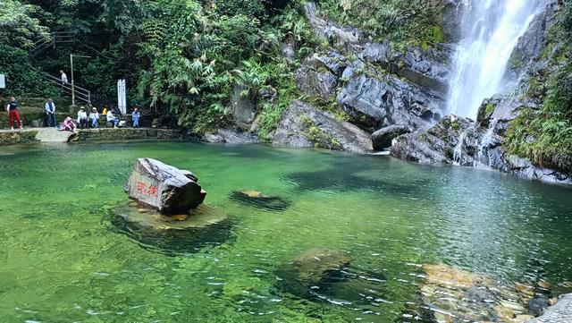 15:00 到达飞水潭,大瀑布下,如注的水流汇成一泓碧水,潭中有刻着“枕流”2字的巨石