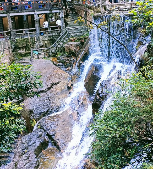 瀑布从40多米高的崖顶深处狂奔而来,直往下飞泻,忽而形成千尺飞流,如白练悬空,忽而溅作满空雨花,如轻纱曼舞.....